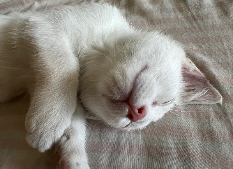 What can I say? The kitten is absolutely THRIVING! It is well taken care of, self-confident, and in just three weeks, it is becoming a mischievous teenager.